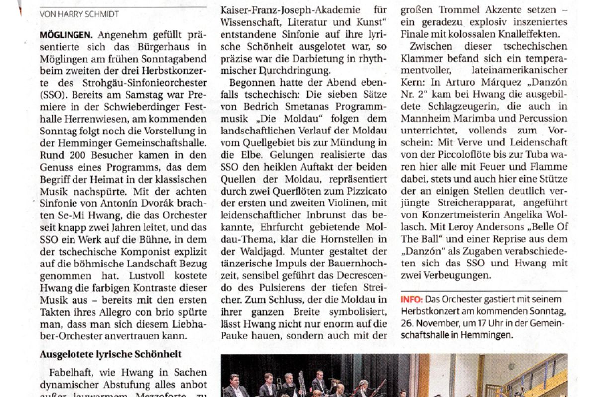 MÖGLINGEN. Angenehm gefüllt präsentierte sich das Bürgerhaus in Möglingen am frühen Sonntagabend beim zweiten der drei Herbstkonzerte des Strohgäu-Sinfonieorchester (SSO). Bereits am Samstag war Premiere in der Schwieberdinger Festhalle Herrenwiesen, am kommenden Sonntag folgt noch die Vorstellung in der Hemminger Gemeinschaftshalle. Rund 200 Besucher kamen in den Genuss eines Programms, das dem Begriff der Heimat in der klassischen Musik nachspürte. Mit der achten Sinfonie von Antonin Dvorak brachten Se-Mi Hwang, die das Orchester seit knapp zwei Jahren leitet, und das SSO ein Werk auf die Bühne, in dem der tschechische Komponist explizit auf die böhmische Landschaft Bezug genommen hat. Lustvoll kostete Hwang die farbigen Kontraste dieser Musik aus - bereits mit den ersten Takten ihres Allegro con brio spürte man, dass man sich diesem Liebhaber- Orchester anvertrauen kann.