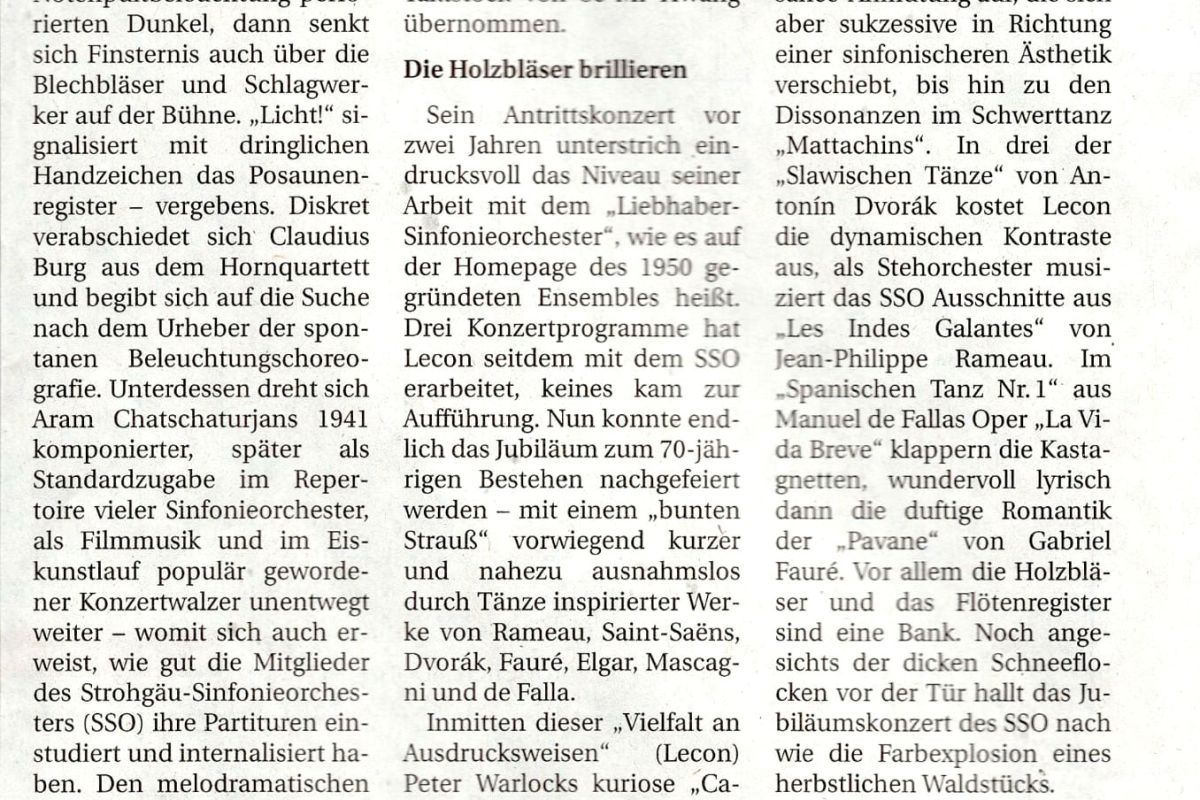 Sein Antrittskonzert vor zwei Jahren unterstrich eindrucksvoll das Niveau seiner Arbeit mit dem "Liebhaber-Sinfonieorchester", wie es es auf der Homepage des 1950 gegründeten Ensembles heißt. Drei Konzertprogramme hat Lecon seitdem mit dem SSO erarbeitet, keines kam zur Aufführung. Nun konnte endlich das Jubiläum zum 70-jährigen Bestehen nachgefeien werden - mit einem „ bunten Strauß" vorwiegend kurzer und nahezu ausnahmslos durch Tänze inspirierter Werke von Rameau, Saint-Saens, Dvorak, Fauré, Elgar, Mascagni und de Falla. Inmitten dieser „Vielfalt an Ausdrucksweisen" (Lecon) Peter Warlocks kuriose "Capriol Suite": 1926 vom englischen Komponisten Philip Arnold Heseltine, so der bürgerliche Name des zeitweiligen Musikkritikers, auf Grundlage einer 1588 publizierten Abhandlung über Tänze geschrieben, weisen die sechs Sätze zunächst eine kammermusikalische Renaissance-Anmutung auf, die sich aber sukzessive in Richtung einer sinfonischeren Ästhetik verschiebt, bis hin zu den Dissonanzen im Schwerttanz „Mattachins". In drei der ,,Slawischen Tänze" von· Antonin Dvorak kostet Lecon die dynamischen Kontraste aus, als Stehorchester musiziert das SSO Ausschnitte aus "Les Indes Galantes" von Jean-Philippe Rameau. Im "Spanischen Tanz Nr. 1" aus Manuel de Fallas Oper „La Vida Breve" klappern die Kastagnetten, wundervoll lyrisch dann die duftige Romantik der "Pavane" von Gabriel Faure. Vor allem die Holzbläser und das Flötenregister sind eine Bank. Noch angesichts der dicken Schneeflocken vor der Tür hallt das Jubiläumskonzert des SSO nach wie die Farbexplosion eines herbstlichen Waldstücks.