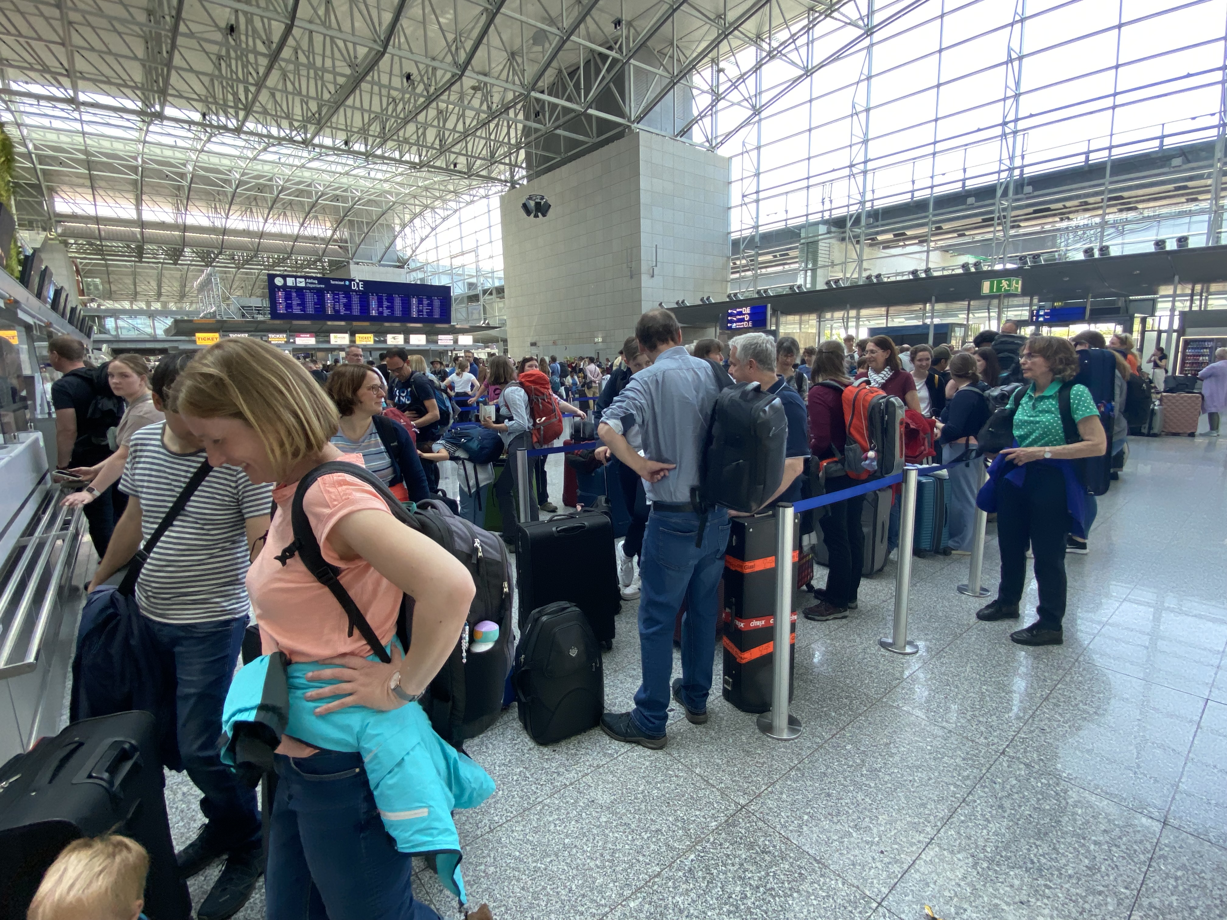 Wir sind am Samstag, den 27.5.2023 zum großen Teil mit der Bahn zum Frankfurter Flughafen gefahren und haben uns dort alle zum Einchecken versammelt. Einige Orchestermitglieder sind mit dem Auto angereist, da z.B. der Transport der Celli mit der Bahn sehr aufwändig ist. Es war eine längere Angelegenheit, bis 50 Orchestermitglieder und alle Instrumente versorgt waren - aber wir hatten Zeit und gute Laune von der ersten Minute an! Die Celli erfuhren eine Sonderbehandlung und durften (mussten aus Sicherheitsgründen) "Sitzplätze" am Fenster erhalten. Kleinere Instrumente wurden beim Security Check begutachtet und es ergaben sich überall interessierte Gespräche zu unserer doch nicht ganz alltägigen Reisegruppe.