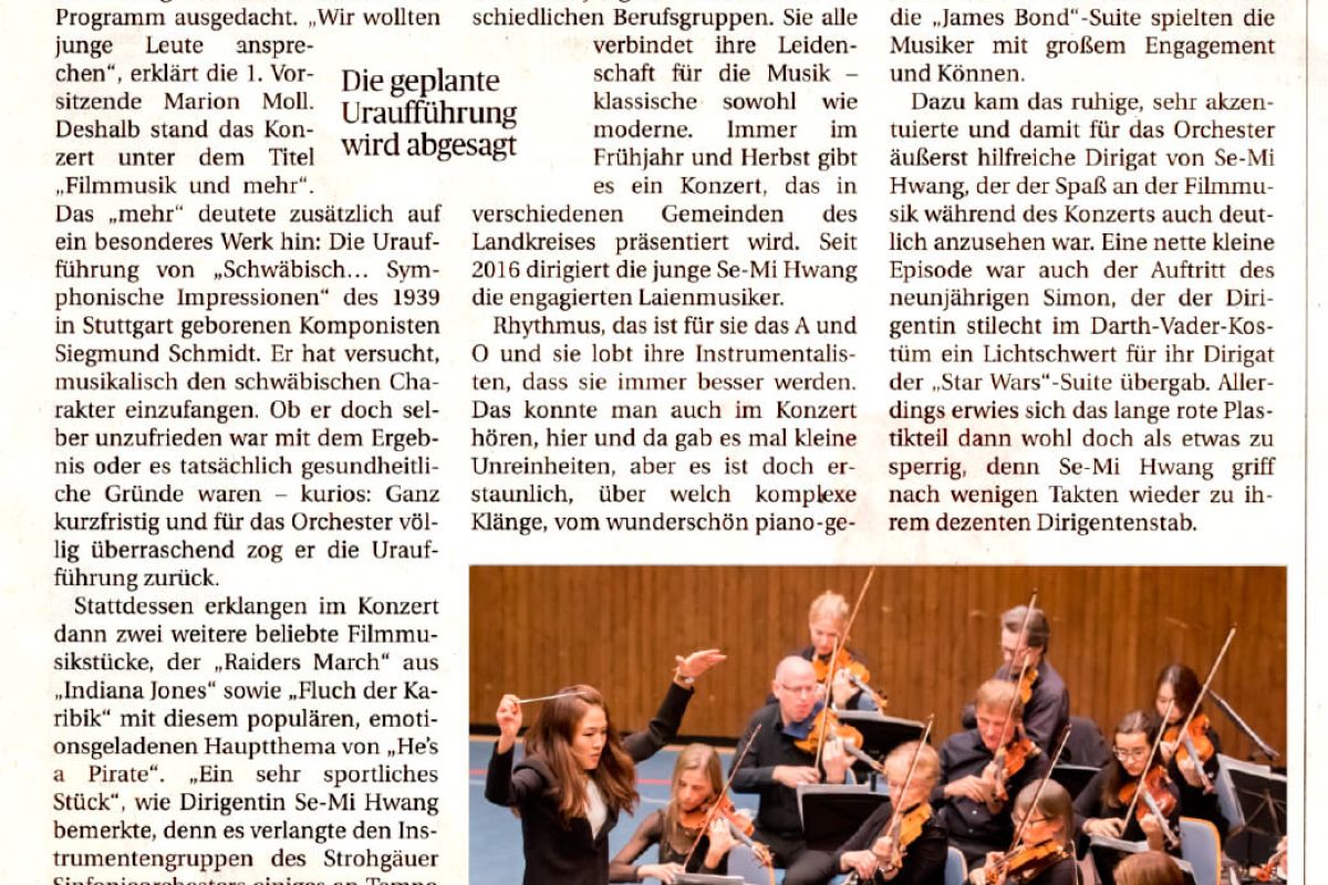Schwieberdingen. Beim traditionellen Herbstkonzert des Strohgäuer Sinfonieorchesters blieben vielen Plätze in der Festhalle frei. Dabei hatten sich die engagierten Musiker gemeinsam mit ihrer Dirigentin Se-Mi Hwang solch ein mitreißendes Programm ausgedacht. "Wir wollten junge Leute ansprechen", erklärt die l. Vorsitzende Marion Moll. Deshalb stand das Konzert unter dem Titel "Filmmusik und mehr". Das "mehr" deutete zusätzlich auf ein besonderes Werk hin: Die Uraufführung von "Schwäbisch ... Sym-phonische Impressionen" des 1939 in Stuttgart geborenen Komponisten Siegmund Schmidt. Er hat versucht, musikalisch den schwäbischen Charakter einzufangen. Ob er doch selber unzufrieden war mit dem Ergebnis oder es tatsächlich gesundheitliche Gründe waren - kurios: Ganz kurzfristig und für das Orchester völlig überraschend zog er die Uraufführung zurück.